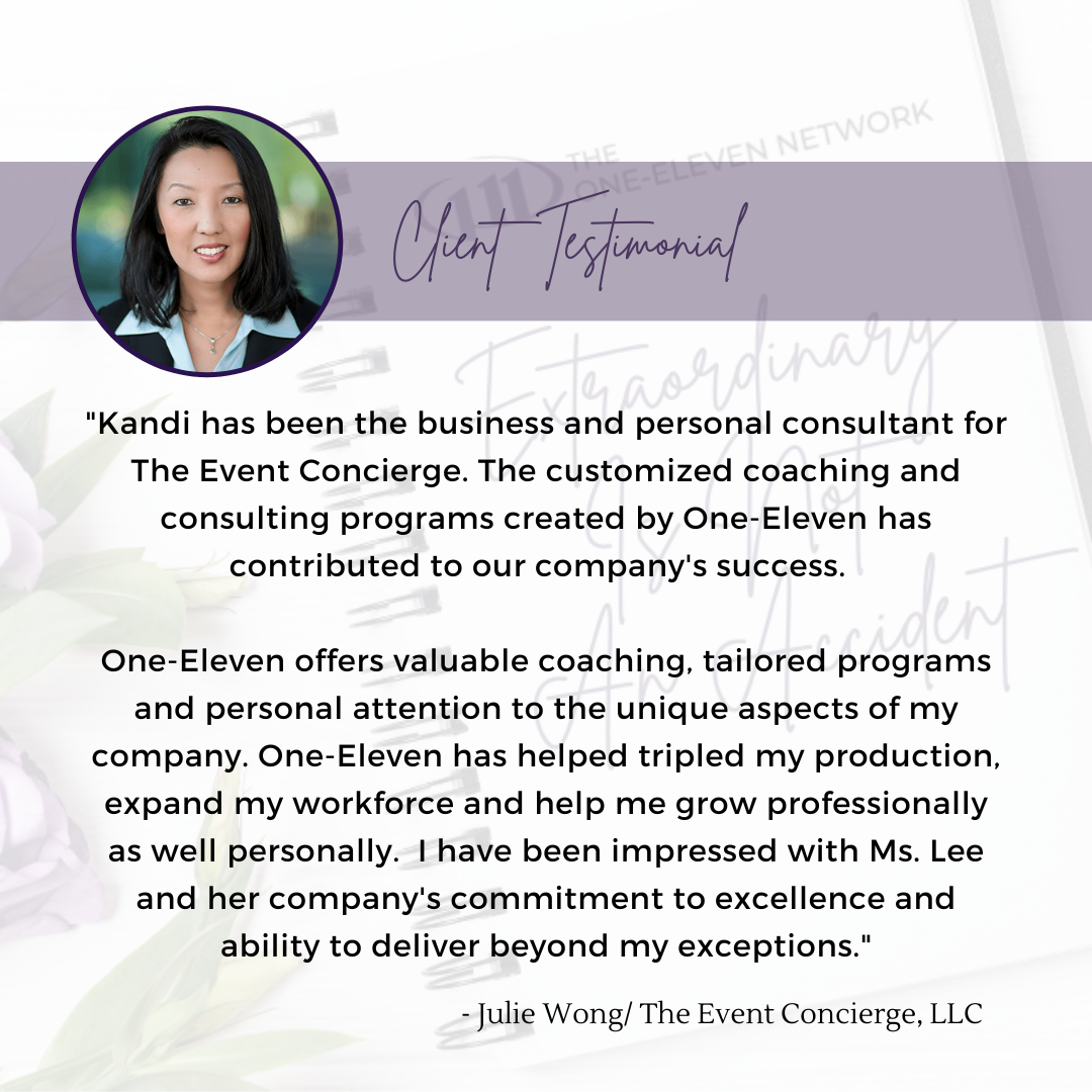 ** Payments for the One-Eleven Network Coaching & Consulting Programs, and the One-Eleven Network Training Programs, may be paid in one payment or on a monthly payment plan. The payment will be taken automatically from the designated credit card on file on the same date of each month. One-Eleven Network programs are non-refundable,non-transferable, and non-cancelable and a commitment to a payment plan is in place until the full payment is successfully completed. If you register for any of our programs, sit on your hands, and do nothing for yourself, we can’t help you. We cannot and do not give any guarantees on results or earnings with our information, courses, programs, masterminds, coaching, plans, tools or strategies. We take our learning environment seriously and maintain a very high standard of positivity, accountability, and, most importantly, action. We stand behind our programs, and we block out dedicated time for each client that is held for the program term.**